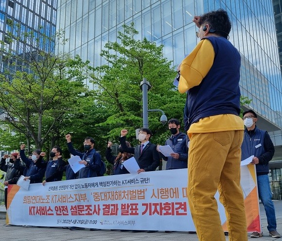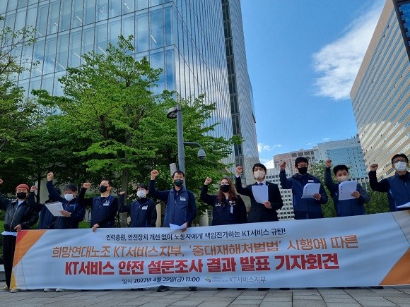 더불어사는희망연대노동조합 KT서비스지부(이하 지부)는 29일 KT광화문빌딩 앞에서 ‘중대재해처벌법 시행에 따른 KT서비스 안전 설문조사 결과 발표’ 기자회견을 열었다.