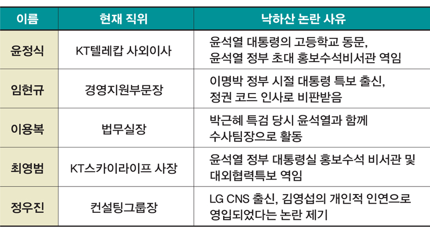 김영섭 사장 취임 후 낙하산 논란이 불거진 KT내 대표적인 인사들은 다음과 같다.(관련기사 링크)