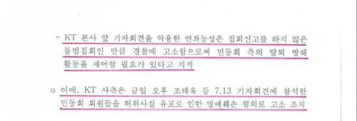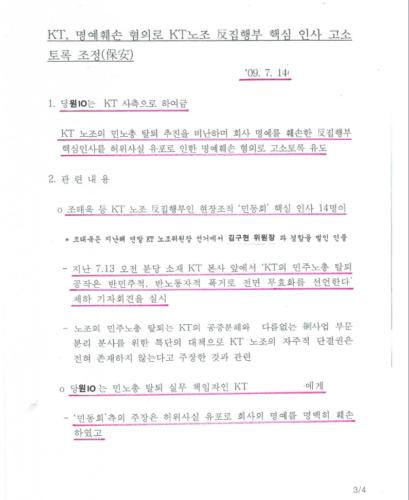 누가 보더라도 사실과 진실에 기반한 기자회견인데 이걸 집시법 위반 및 명예훼손 등 혐의로 고소하도록 국정원이 KT노사팀에 지시한 국정원 문건도 정보공개 청구를 통해 뒤늦게 확보하였습니다.(첨부 국정원 문건 참조)… 실제로 노사팀 최용남이 고소장을 당일 분당경찰서에 접수하였고, 속전속결로 2009년 벌금 약식명령 처분을 받았음(국정원 문건은 2021년에 정보공개청구로 받았음)