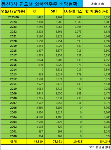 KT 연도별 외국인 주식보유량 및 배당현황(2000_2025.06 분기배당 세부내역 포함) SKT 연도별 외국인 주식보유량 및 배당현황(2000_2025.06 분기배당 세부내역 포함) LG유플러스 연도별 외국인 주식보유량 및 배당현황(2000_2025.06 중간배당내역 포함)