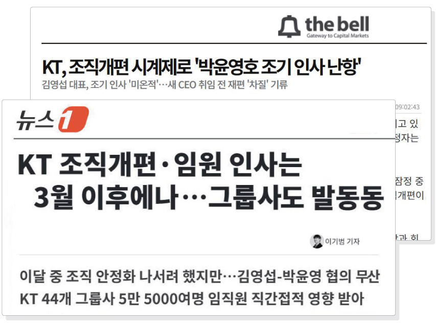 한편 김영섭과 박윤영 사장 내정자 사이에 ‘적당한 타협’을 통해 설 전후로 소폭의 임원인사와 조직 개편이 진행될 가능성을 완전히 배제할 수는 없다. 이 경우에도 본격적인 조직개편은 4월 후로 미뤄질 것인데, 그 동안 계속 망가질 KT는 누가 책임질 것인가?