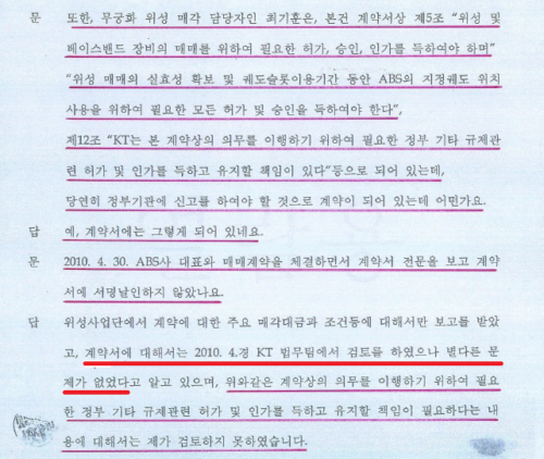 ▲무궁화3호 위성 매각 계약서 제5조 및 제12조에 제반 허가 승인 및 인가을 득하도록 명시되어 있으나 법무팀 별다른 문제 없었다는 김성만 증인신문조서 18쪽