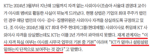 ▲이사 자격 득실 여부는 이사회 사무국 업무의 기본 중 기본이라는 조선일보 2026.4.8.자 기사_KT사장 기본부터 바로 세워야